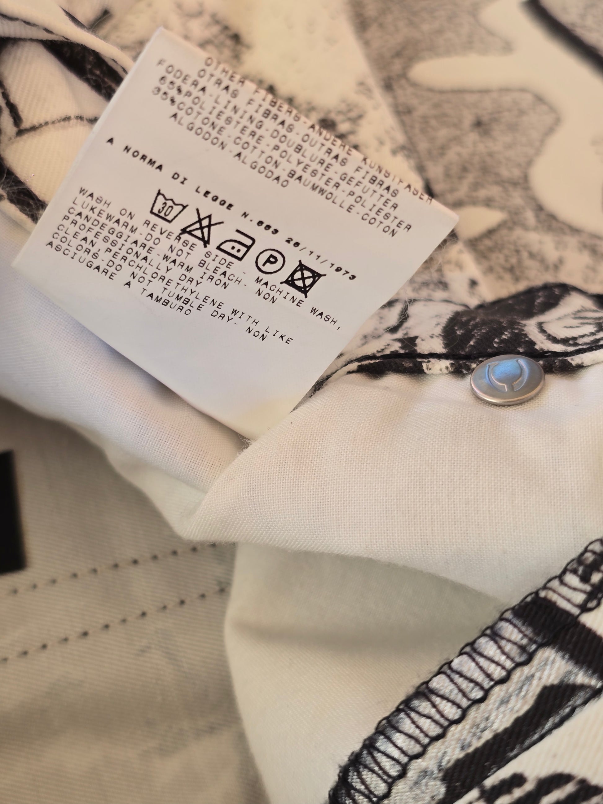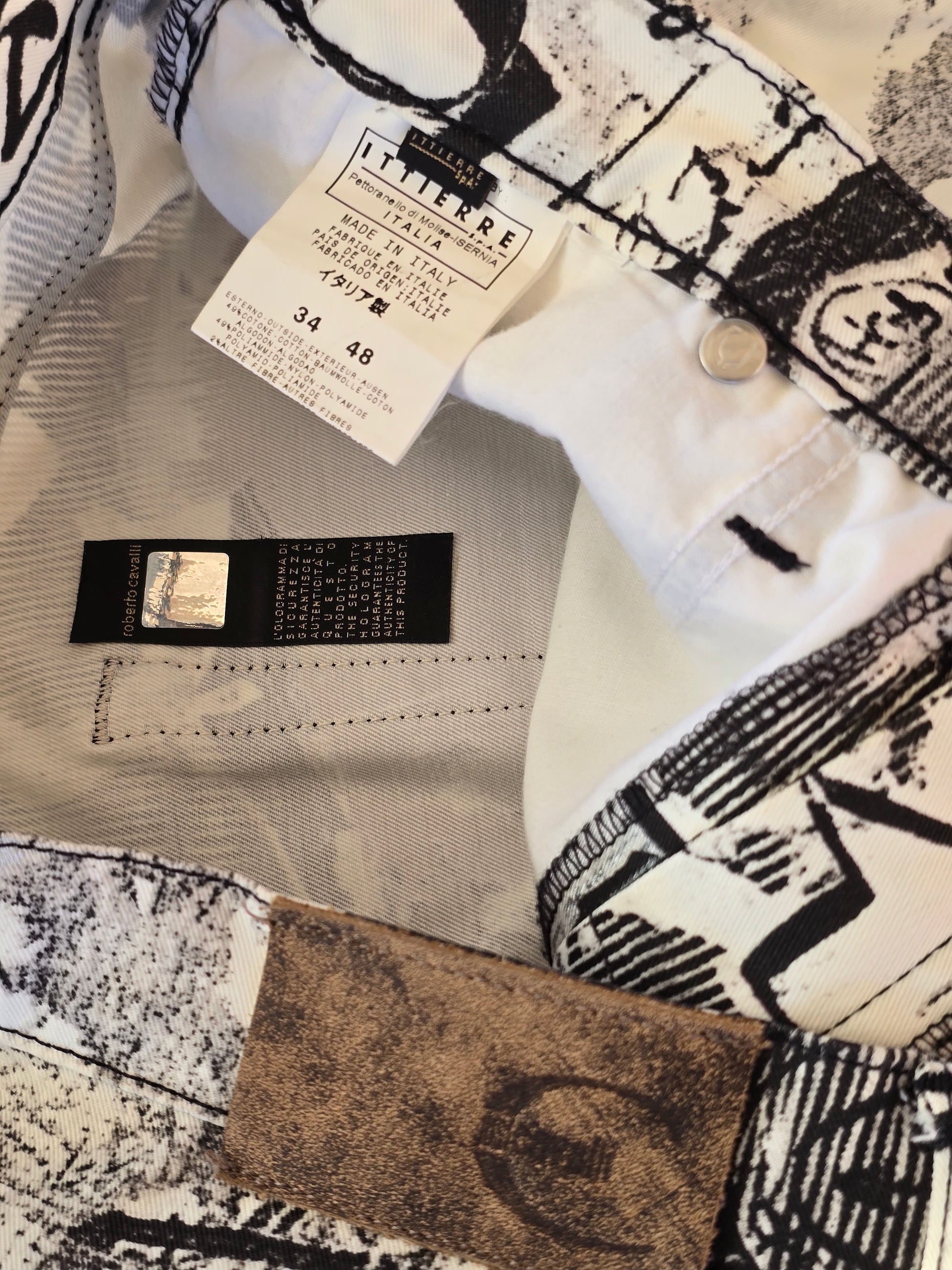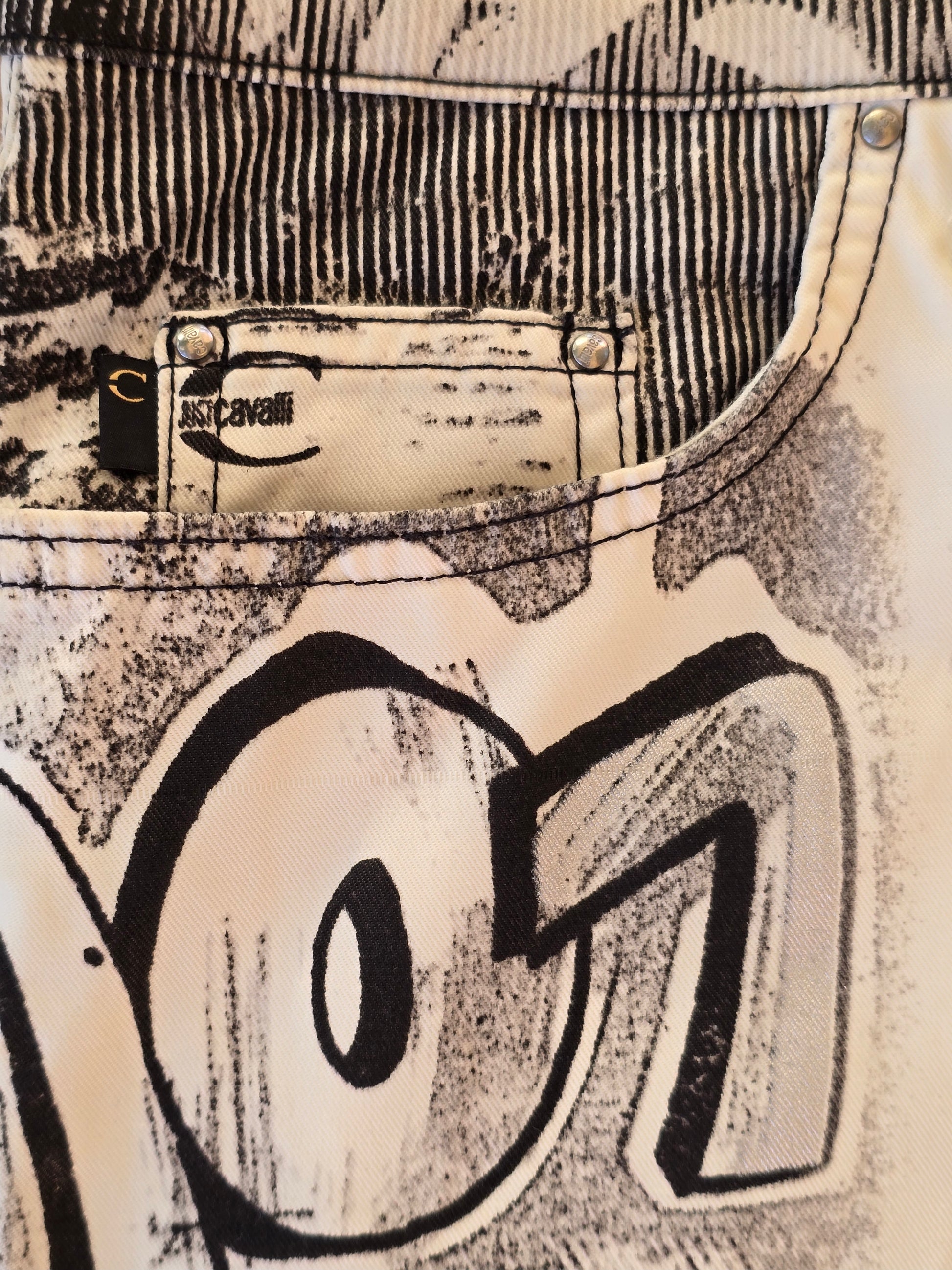 Low-rise straight-leg pants with a gentle flare, crafted in Italy by Ittierre S.p.A. for Just Cavalli’s Spring/Summer 2002 collection. The all-over black-and-white graffiti-style print combines bold “LOVE,” “BAD” and “STYLE” letterings with halftone dots, spray-paint splashes and stencil motifs.