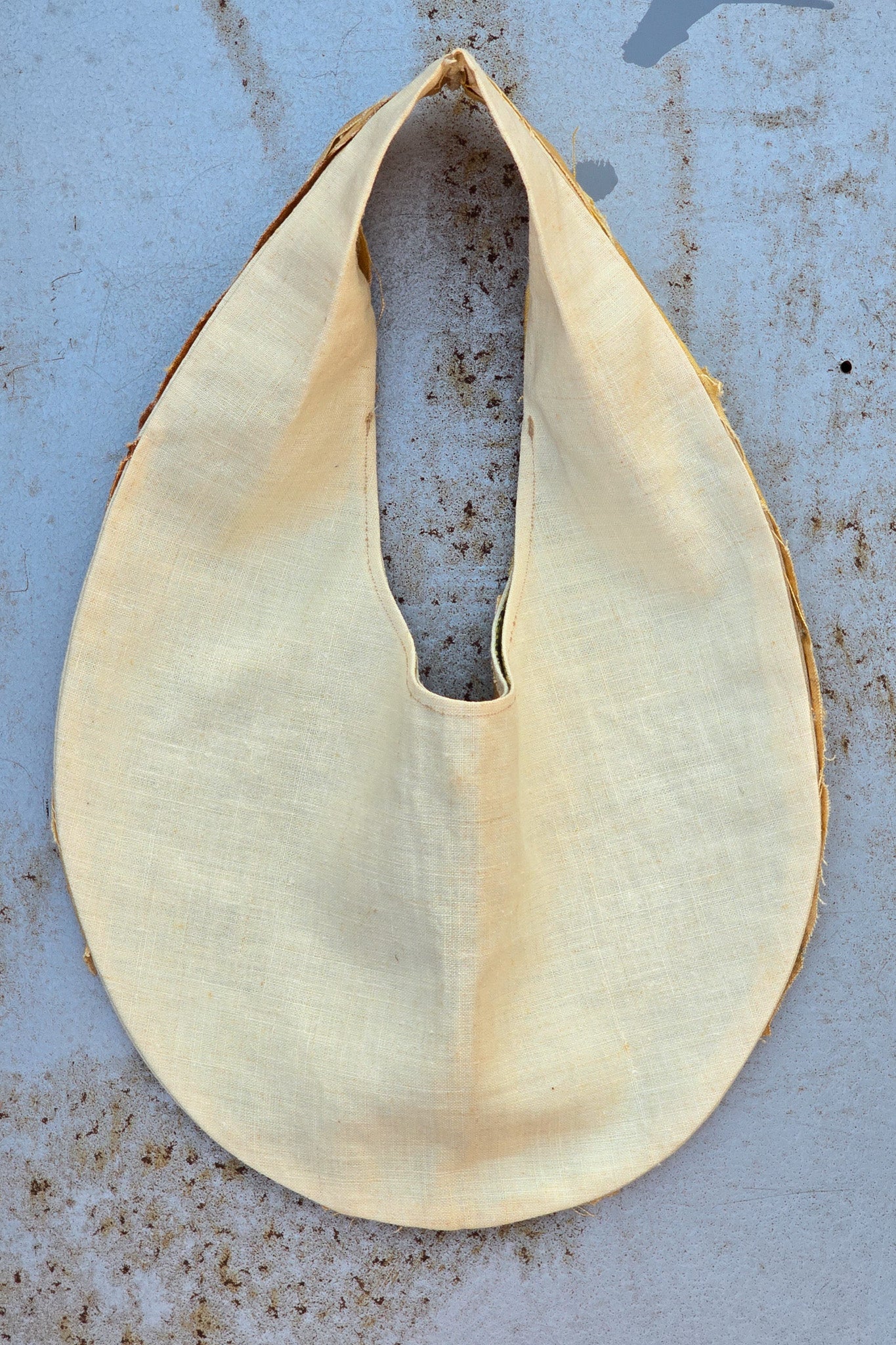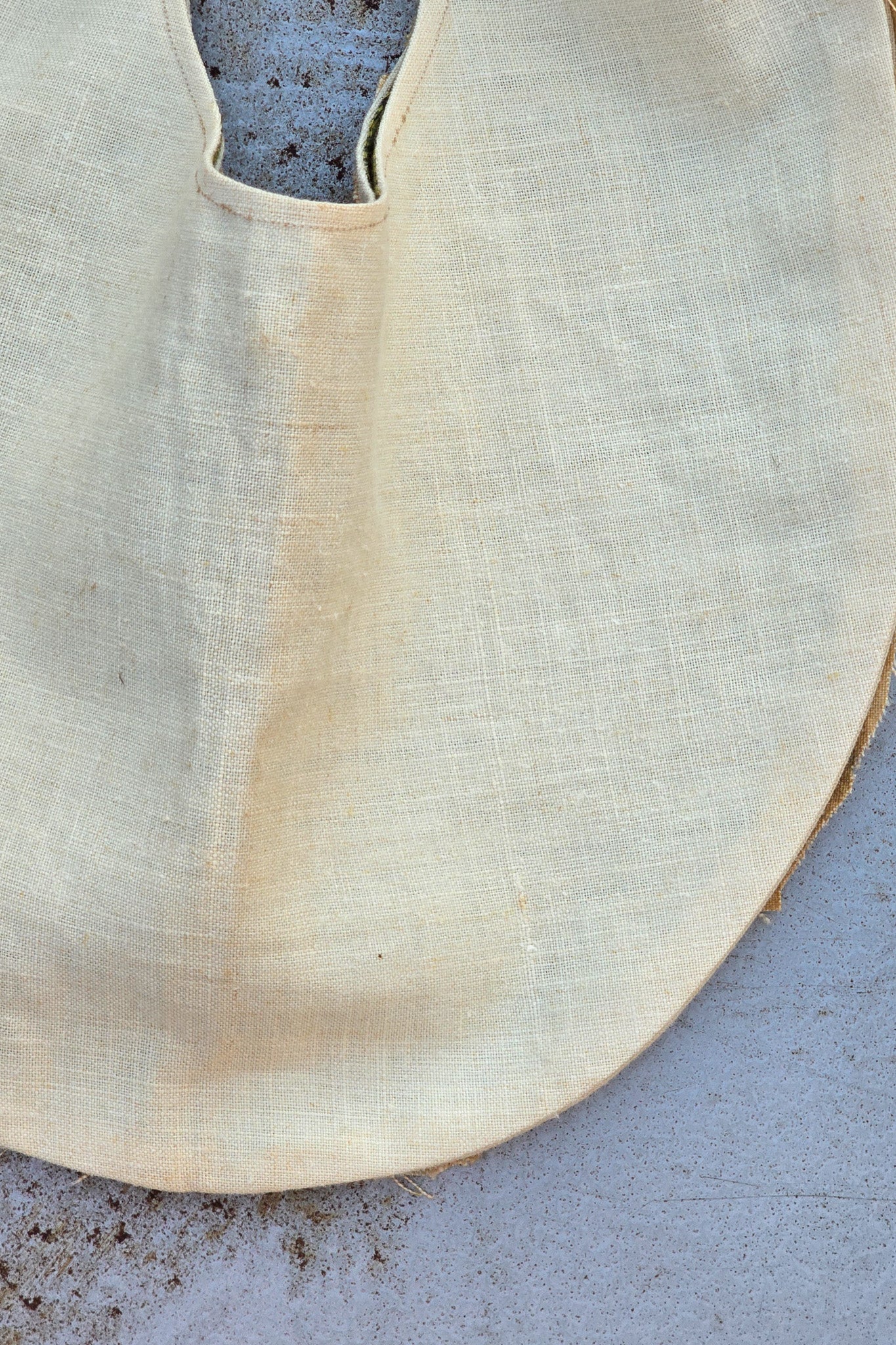 One-of-one hobo bag, handmade in Italy from original 1961 military canvas. Each bag has a clean side and one with a distressed panel, crafted from production scraps of the same fabric. Some feature a unique tie-dye treatment.