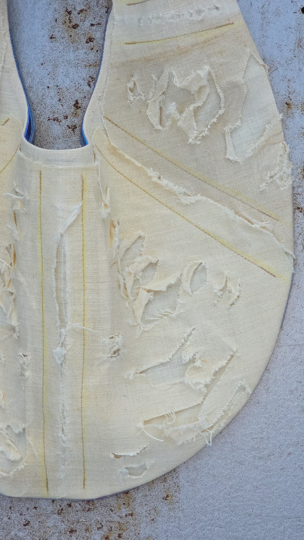 The lining is made from repurposed military-issue cotton bedsheets, individually tie-dyed for a unique, textured interior. Secured with a magnetic button closure.
