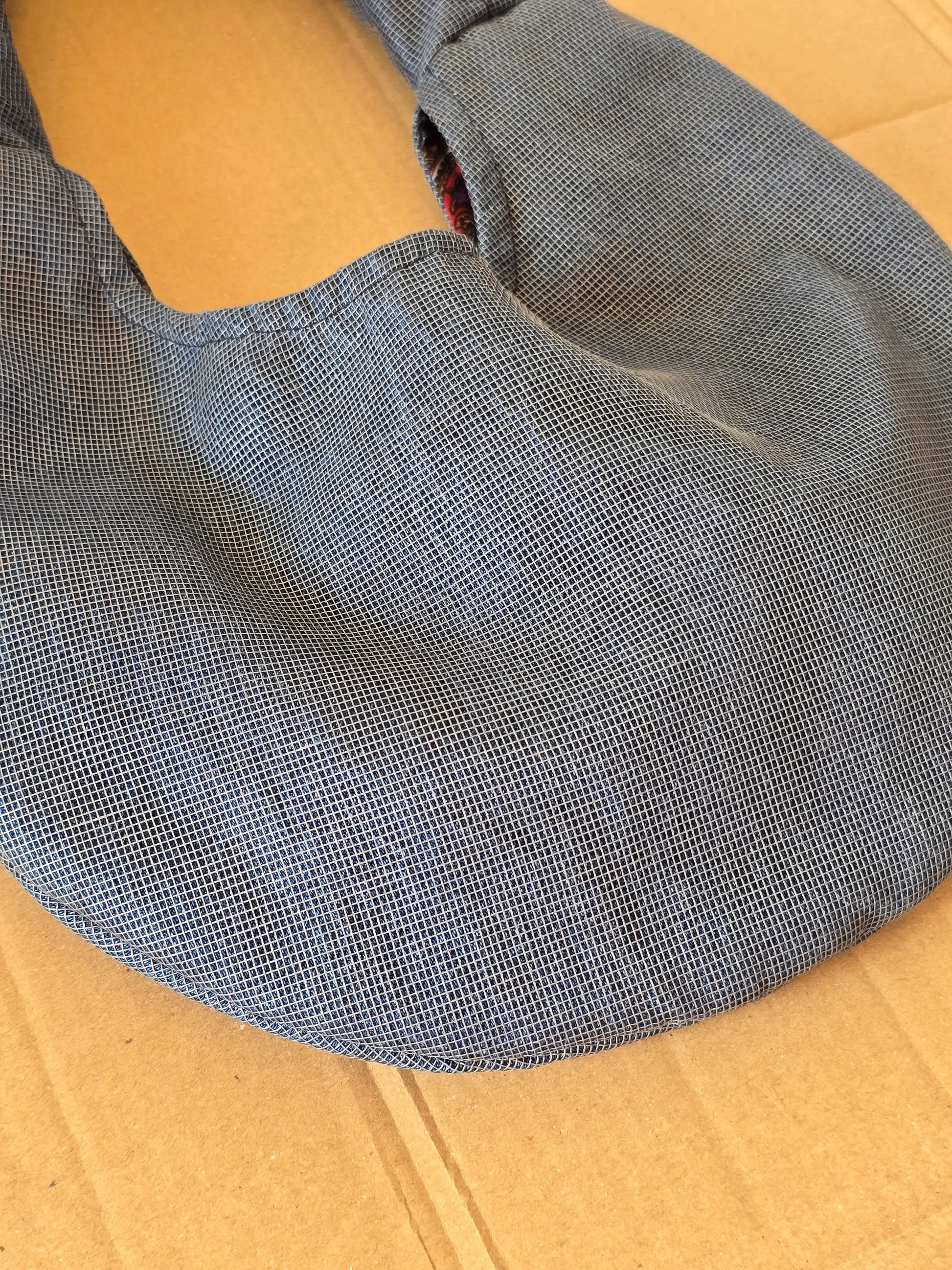 Hobo bag in blue denim, fully covered with mosquito netting including the handle. Interior lining in recovered fabric. Magnetic button closure.