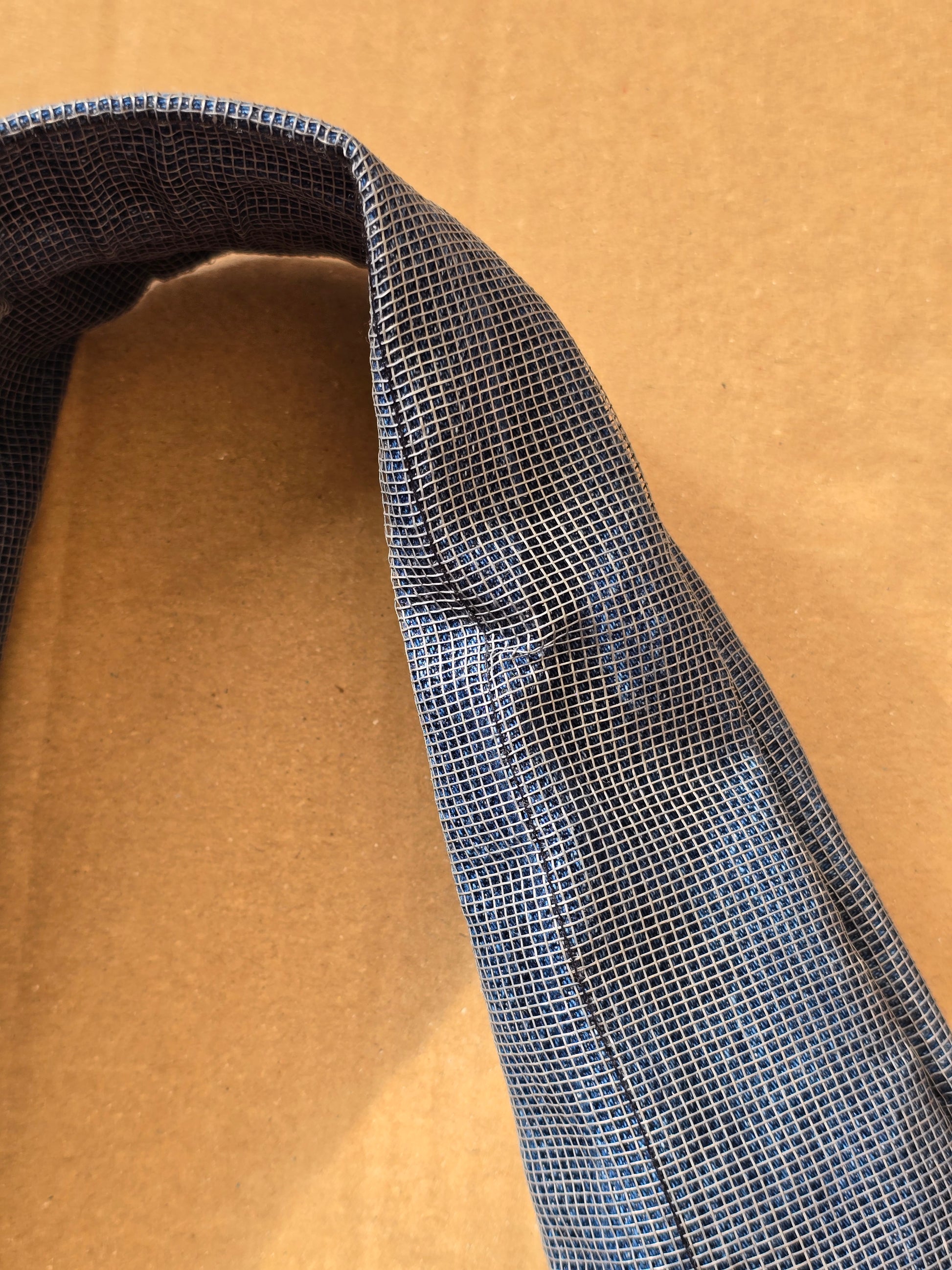 The overlay of netting alters the surface and volume of the denim, creating a layered texture that obscures and protects the base. Irregularities and tonal variations are integral to the process and affirm the zero‑waste approach.